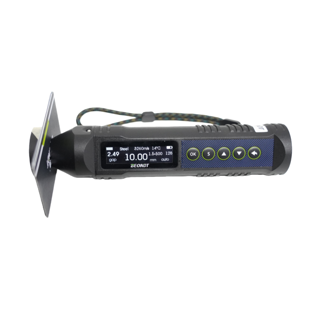 BEONDT EMA1900 electromagnetic ultrasonic high-temperature thickness gauge is specifically developed for measuring the thickness of steel pipes, rolled plates, bars, and other products made of steel, aluminum, and other metals. The working gap between the sensor and the metal can be as low as 4mm. Operation of the electromagnetic ultrasonic high-temperature thickness gauge does not require pre-cleaning of the surface or a coupling agent. The gap can be dirt, rust, salt deposits, or other non-conductive coatings (paint, varnish, enamel, plastic, etc.). In addition to measuring the thickness of metals, the EMA1900 can also measure the thickness of non-conductive coatings on metal workpieces. Thanks to its specialized sensor, the EMA1900 electromagnetic ultrasonic high-temperature thickness gauge can measure the thickness of metal workpieces heated to 800 degrees Celsius. This device employs a special data processing algorithm, enabling users to accurately measure the thickness of metal workpieces even in the presence of interference factors (such as metal anisotropy, the presence of multiple reflectors, and external interference). The built-in algorithm reduces the impact of human error on the test results and simplifies the device's interface.